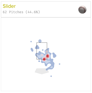 He backs it up with a four-seam fastball at 93.7 mph, one that’s exactly average in its IVB (16.0 inches) and below-average of horizontal movement by 2.5 inches over the average (so a little bit of deadzone shape to it, unfortunately). He threw it 40.4% of the time as his lead pitch last year and has backed off to 34.5% so far this year, lowering the BAA by the fastball from .333 to .273.