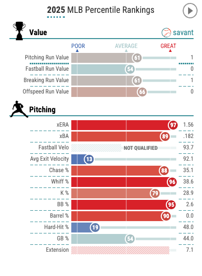 That’s a 28.9% strikeout rate and a 2.6% walk rate. When you dive into the numbers, it’s slightly lucky but not egregiously so: The 1.00 ERA comes with a 1.24 FIP and 1.56 xERA. The fundamentals are good, too: He put up a slightly-above-average 31.7% CSW with an 18.7% swinging strike rate.