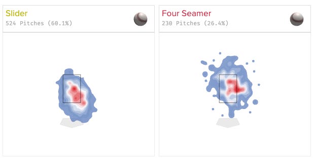 I do think the locations could use some work, though. The slider is mostly thrown in the zone and the curveball below, but the fastball sits in or just off the zone, roughly in the same band of the zone as the slider. Here’s a screenshot - see how both are middle-up with a lot of overlap?