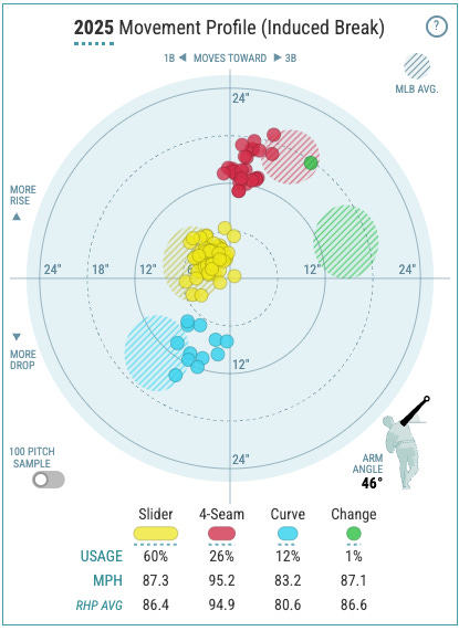 Kinley has a similar adjustment period in front of him. He throws two distinct breaking balls, a slider at 87 mph with 60% usage and a 83 mph curveball at 12% usage. The bulk of the remaining usage goes to a 95 mph four-seamer at 26% usage and the occasional changeup, 87 mph and thrown only 11 times out of 872 pitches this season.