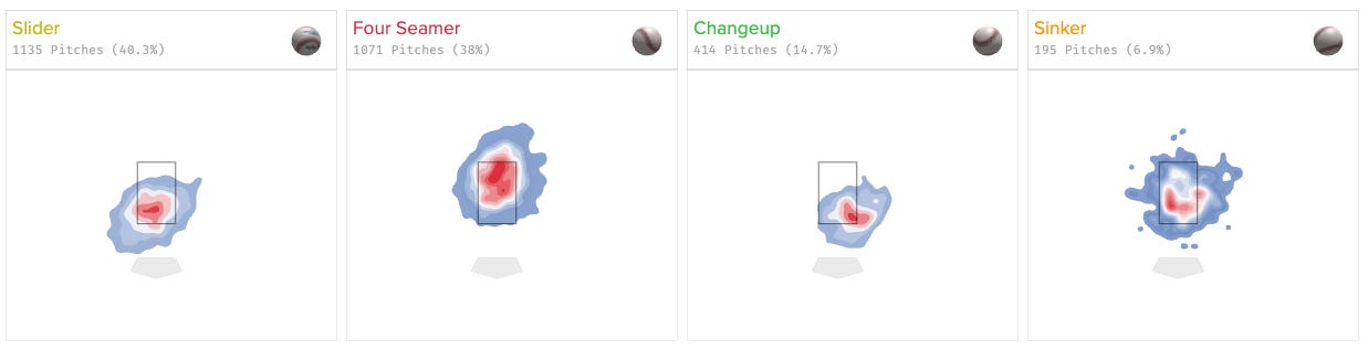 But I did notice that his arm angle has dropped a bit this season, going from 11° to 7°. As we discussed when breaking down Bryce Elder, an arm angle drop can change the horizontal movement of several pitches. I’d speculate that this, combined with some sort of lower-body mechanical deficiency that’s causing him to not properly harness the entire kinetic chain, is impacting both the movement of several of these pitches as well as his locations.