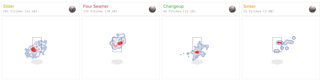 The movement’s a bit different for each pitch, but not in a way that explains this. The four-seamer, for instance, lost an inch and a half of horizontal movement year-over-year, but only three-tenths of an inch of drop. The changeup lost an inch of drop, yet is coming in lower than usual even with less drop. The sinker’s the real victim here - losing 3.3 inches of actual drop and 1.5 of IVB while maintaining the exact same amount of armside movement, an above-average 17.8 inches.