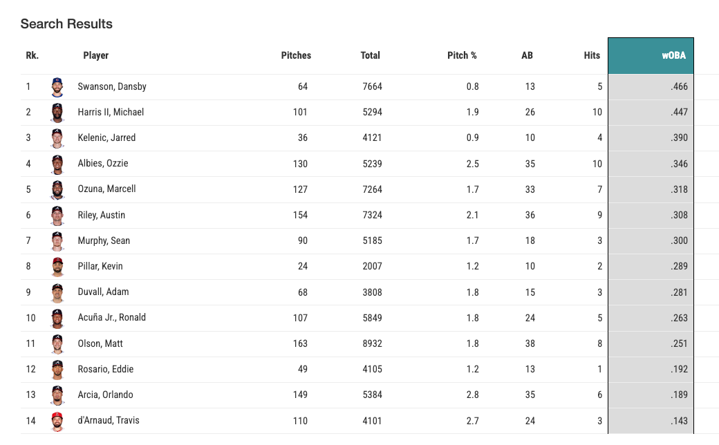 - We want a representative sample with Atlanta. - Result: Our Statcast search is looking at the last three seasons for at-bats while the player was a member of the Braves, with a minimum of 10 PAs