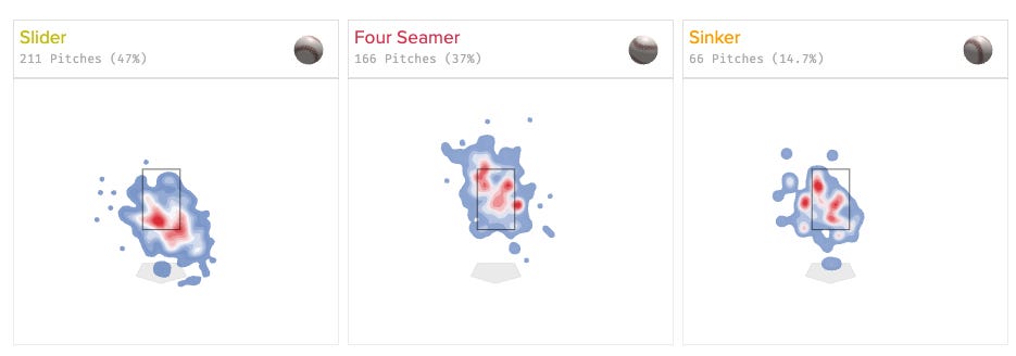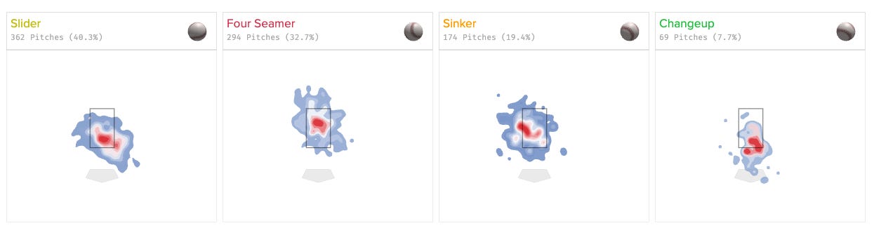 Here’s the Statcast heat maps for his primary pitches in 2024: